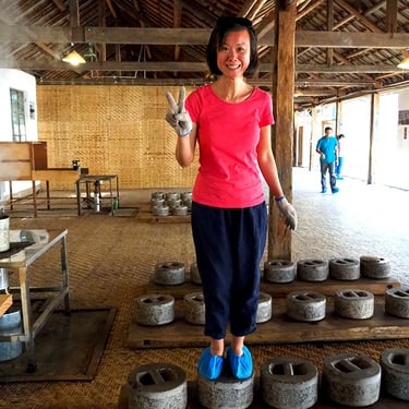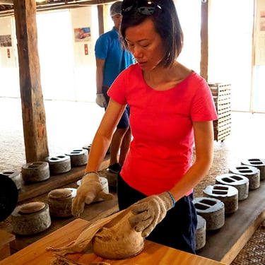 La compression se fait avec 357 g de thé déposés dans un cylindre dont le fond percé de petits trous laisse passer la vapeur. Le thé ainsi ramolli est tout de suite placé dans un linge en tissu, et compressé dans un moule en forme de galette par une lourde pierre. Un dernier séchage au soleil clôture le processus avant l’emballage.